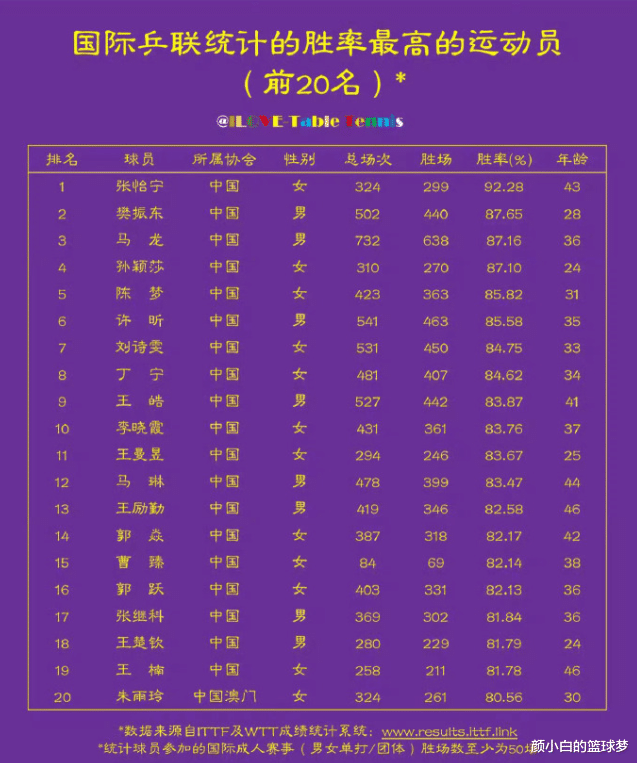 国际乒联统计胜率最高的20位运动员,张怡宁胜率92.28%第一,樊振东87.65%第二,马龙87.16%第三。